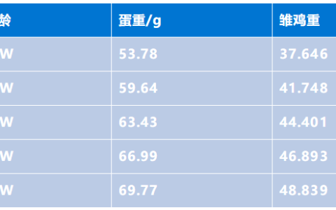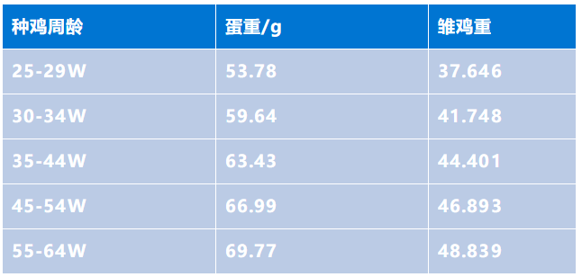 蛋重的70%约等于孵化出雏鸡的重量,随着种鸡日龄的增加,蛋重增大,鸡苗体重增大,由此通过雏鸡体重回溯种鸡周龄,并且通过后期跟踪判断所出现的问题。下表数据是罗斯308种鸡蛋重与周龄之间的关系: