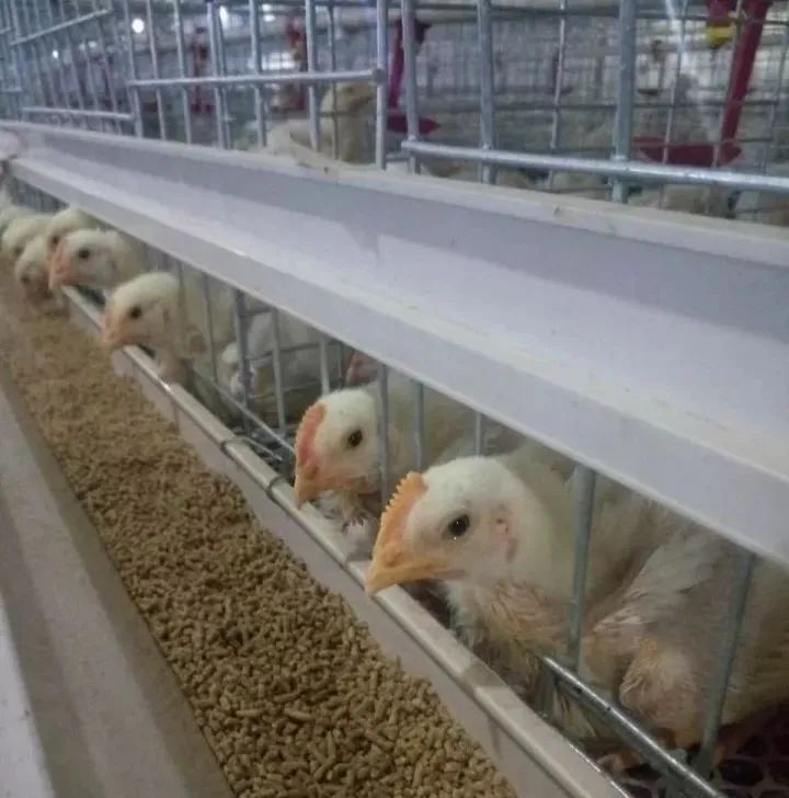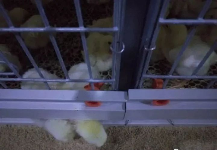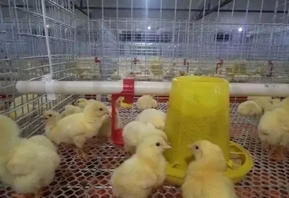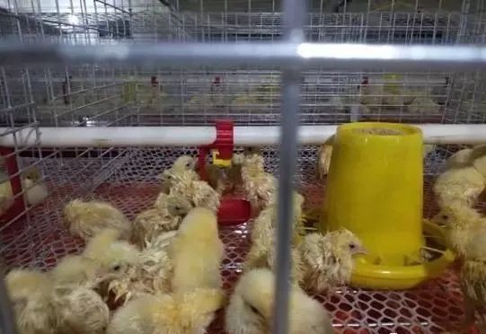 五.用料槽开食,挡料板要调整合适,一般2cm空隙即可,发现在笼内跑出的小鸡及时将其抓回笼中,防止其在外面脱水。