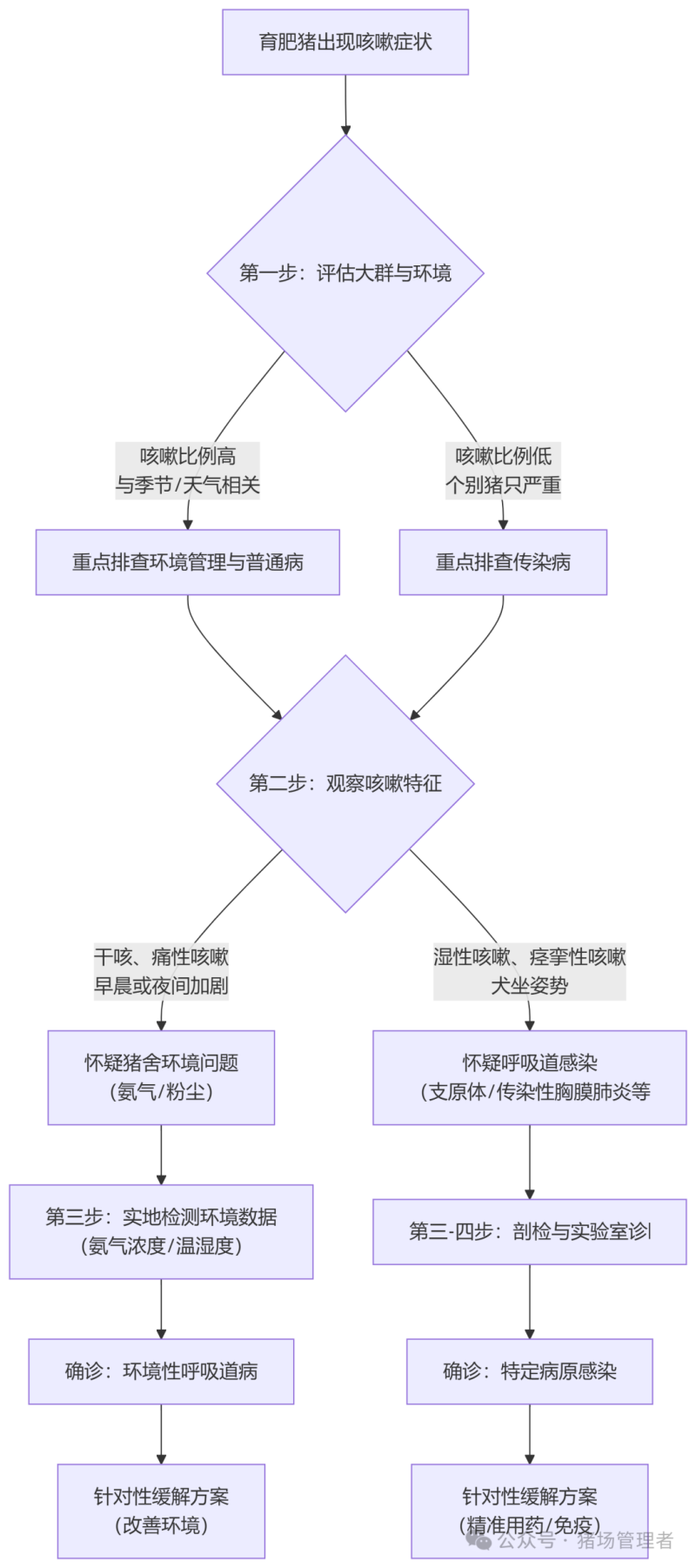 全群性、高比例(>30%)咳嗽: 首先强烈怀疑环境问题(如氨气超标、昼夜温差大)或猪支原体肺炎(喘气病)这类普遍存在的疾病。
