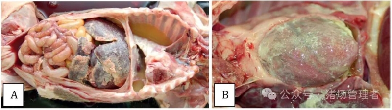 组织学上,中性粒细胞浸润浆膜和滑膜,细菌通过免疫组织化学检测到。慢性病变包括心包和胸膜纤维化,可能导致粘连和突发死亡。文献强调,在幼猪中,病变多系统性,涉及脑膜(59%)、腹膜(57%)和关节(50%)。
