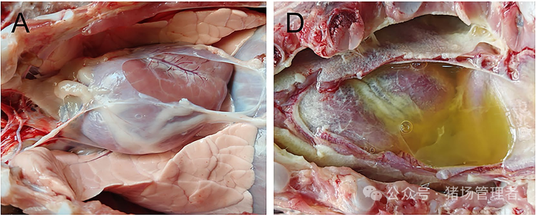 病理变化主要为纤维素性炎症,与日龄相关,幼猪病变更严重。尸体解剖显示,多浆膜炎、关节炎和脑膜炎是标志性病变。在超急性病例中,病变最小,仅见器官点状出血和败血症迹象,如微血栓和DIC。急性病例中,浆膜表面覆盖纤维素渗出,胸腔、腹腔和心包积液增多。肺部可见水肿和充血,关节腔内纤维素,脑膜混浊伴血管炎。