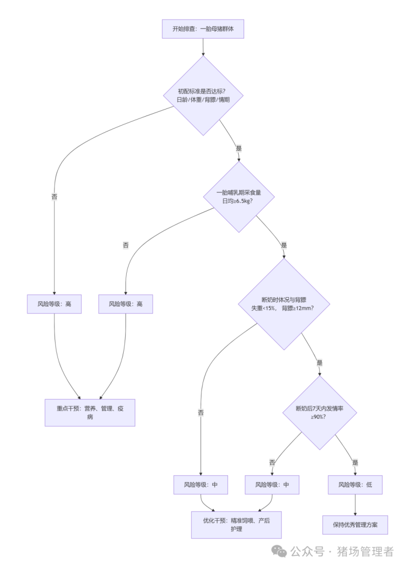 对于猪场而言,关键在于预警和预防。以下排查流程,可以帮助您系统评估场内一胎母猪群发生二胎综合征的概率。