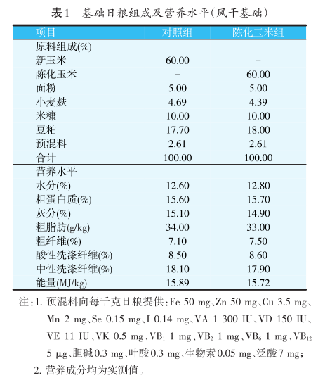 对照组所用玉米为2017年的新玉米,产地黑龙江,储存期一年;试验组所用玉米为2014年的陈化玉米,产地黑龙江,储存期三年。