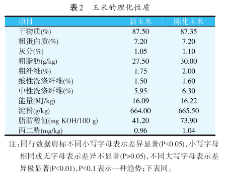 由表2可知,陈化玉米与新玉米的干物质、粗蛋白质、粗灰分、淀粉和丙二醛的含量差别并不大,粗脂肪、能量和纤维含量偏高些,但陈化玉米的脂肪酸值是新玉米的1.79倍。由表3可知,陈化玉米和新玉米中所检测的3种霉菌毒素的含量均未超过国家限量标准。