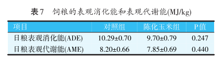 由表7可知,与对照组相比,陈化玉米组对生长猪的饲粮表观消化能和代谢能无显著影响(P>0.05)。