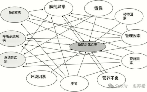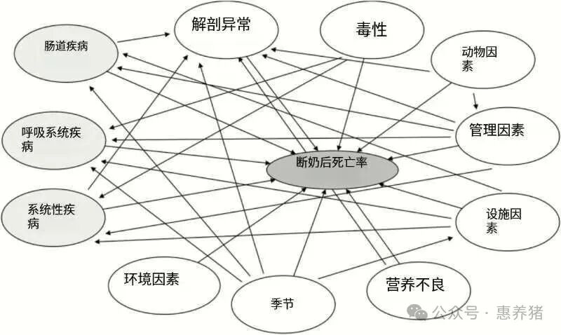 导致断奶后死亡率的因果网络,包括非感染性(白色)和感染性(灰色)原因。箭头表示一个原因影响另一个原因的途径。