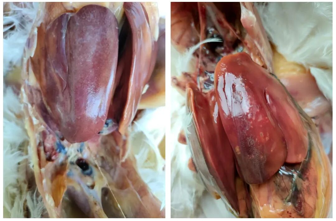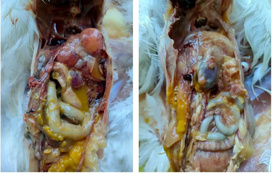 解剖患病母鸡可见,腹腔内积聚大量黄色恶臭液体,心脏、肝脏等内脏器官表面覆盖一层黄色纤维素性渗出物,并附着破碎的卵黄组织。腹腔内常出现拳头大小的蛋黄凝块,病程较长的病鸡还会出现肠道与其他器官粘连的现象。
