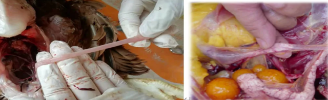 生殖型传支全程可感染,该病毒可在鸡只的输卵管中进行复制,对雏鸡和育成鸡的输卵管造成永久性损伤,出现“假母鸡”现象,导致感染鸡只寡产,严重者不产蛋。