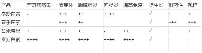 泰万菌素与其它相关产品的功能对比情况