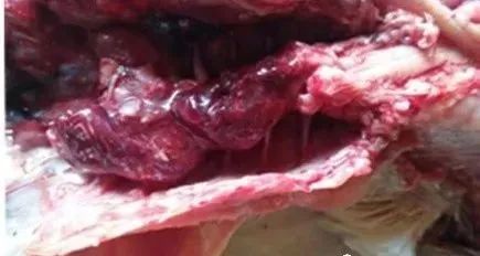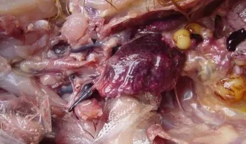 病理变化:肉鸡、817等快大肉禽,主要集中在肺脏,细支气管,胸气囊,发病前期一侧肺脏潮红,随着病程的发展一侧肺红紫,肺脏由白色纤维素渗出物。气囊炎形成,严重者形成黄色干酪物。病程稍长者继发病毒及大肠杆菌,形成包心、包肝,