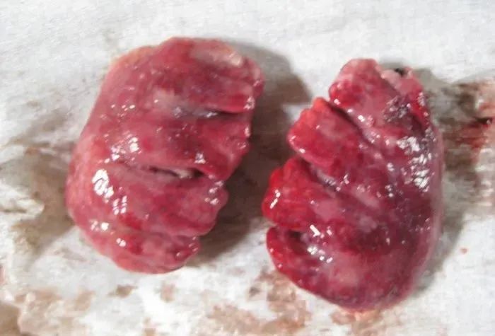 中医:寒气入侵,肺部的热量不能通过呼吸排泄出去,淤积在肺脏形成郁结,导致肺脏慢慢变黑。郁结时间长了,肺脏的机能就会减弱,热量排出更加困难,肺脏由于过热慢慢的造成肺脏的坏死、水肿,因此,呼吸道病治疗不当的家禽,中后期(5天以后)会有肺发黑、水肿、坏死等现象。