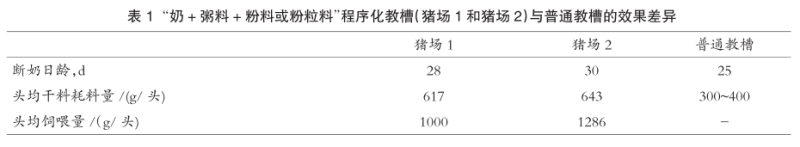饲料禁抗后,有两个用料结点需要特别关注:(1)断奶头3天内;(2)30~70kg体重之间。要解决断奶头3天内断奶仔猪的采食量和腹泻问题,必需从教保料配方和教保料使用程序上入手。如果教槽料有非常好的诱食性和适口性,那么可以在断奶后直接用粉状教槽料开饲,效果良好。如果直接用教槽料开饲的效果不理想,那么就需要考虑设计哺乳基本的教槽程序。推荐采用“奶+粥料+粉料或粉粒料”的程序化教槽方式。实际应用中可以达到表1中所列数据的效果30~70kg之间的主要问题是保育结束后换料应激腹泻。解决办法就是尽量不要在这个阶段换料。这个阶段猪的生长速度很快,对肠道菌群的稳定性较为敏感。