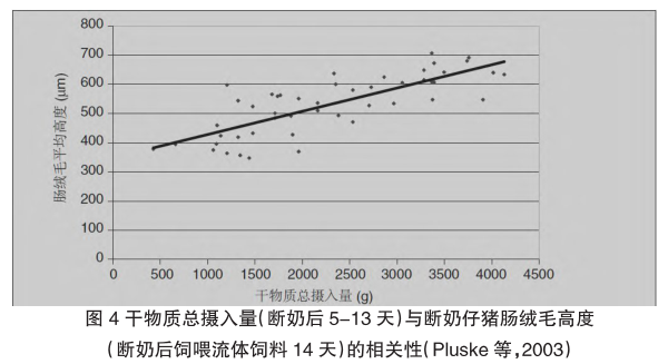 研究发现,断奶后第1周(特别是头3天)的采食量是非常关键的。断奶后第1天的采食量>50克才能基本维持仔猪不掉膘。采食量高是断奶仔猪更快生长的保障。如果断奶后头3天采食量不足引起掉膘,商品猪的出栏时间至少推迟1周,甚至更多(如图2和图3)。断奶后保持充足的采食量是维护肠道粘膜结构和功能完整的基础,因为干物质摄入量与肠道绒毛高度、绒毛完整性呈正相关关系(如图4)。可以看出,采食量低是最根本的诱因,因此如何增加断奶仔猪的采食量且不腹泻是无抗断奶仔猪料的核心技术。