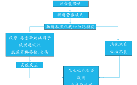 维护肠道健康是断奶仔猪料的核心目标,高采食量、高消化率是实现该目标的根本基础。乳猪断奶后,环境和饲粮改变导致采食量降低,进而引起肠道营养缺乏,肠道粘膜功能受损。肠道结构受损产生的后果就是消化吸收不良,再加上饲料中的抗原(如大豆抗原)毒素被肠道吸收,肠道菌群移位和过度繁殖引起肠道炎症。最终导致生长性能变差,腹泻,甚至生病。