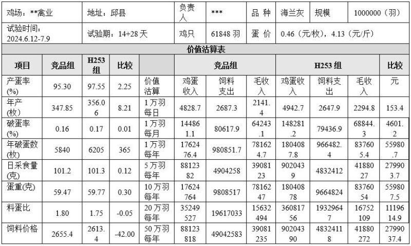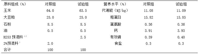 备注:H253组:玉米635,豆粕250,豆油5,石粉85,预混料25;竞品组:玉米640,豆粕250,豆油5,石粉85,预混料20。