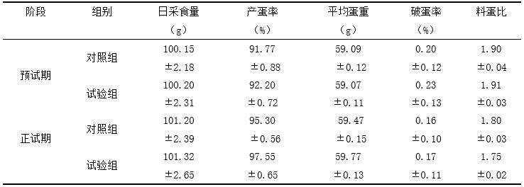 从表2可看出,预试期时,对照组和试验组的日采食量、产蛋率、平均蛋重、破蛋率和料蛋比差异都不显著(P>0.05)。