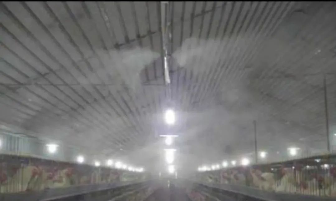 通过雾线喷洒雾或者结合鸡舍消毒,利用雾化水将粘附粉尘,形成比重更大的颗粒物而加速沉降。根据喷洒速度的不同,可使粉尘浓度降低大约60%~80%,但也存在增加舍内湿度、沉降粉尘不易清除等缺点。