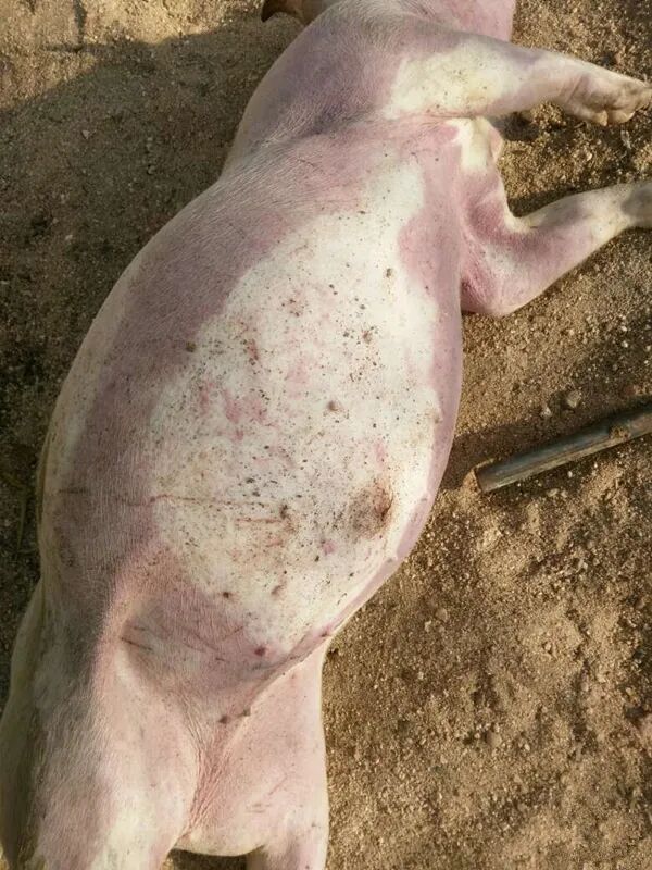 其他病猪的发病症状为:体温不超40.5度,呼吸很急促而且猪鼻孔里口腔内都带有泡沫,一些病猪在泡沫中有血液;全身苍白或者是紫绀,站不稳最后趴在地上死去。整个病程大概是1到4个小时。少数特例病程达到12小时往上,那么精神沉闷,呼吸差而死。很大程度上的猪死后肚皮肿大。