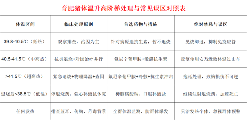 育肥猪体温升高的处理原则是 “退烧是手段,控因是目的” 。体温是免疫系统与病原的博弈,单纯用药将体温强行压回正常值,往往掩盖了病原正在扩散的真相。临床处理必须遵循 “先辨因、再定策、慎用退烧药” 的阶梯思维。
