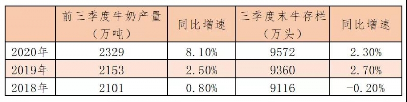 2020年奶业生产保持稳定发展。统计局数据显示,前三季度牛奶产量2329万吨,增长8.1%。农业农村部总畜牧师马有祥在12月15日的新闻发布会上介绍,今年我国奶业保持良好发展势头,前三季度牛奶产量增速创近五年新高,上半年生鲜乳和乳制品抽检合格率保持在99%以上。