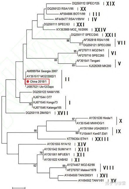 我们可以看到,图中红框处即为本次爆发的非洲猪瘟病毒株,它在进化关系上和,与目前在俄罗斯和东欧流行的格鲁吉亚毒株(Georgia 2007)同属于一个进化分支,基本上可以确定是来自于俄罗斯,事实上,根据基因比对,其基因序列有417 个碱基与俄罗斯毒株 100% 匹配,更是确定了该非洲猪瘟病毒的来源:俄罗斯。