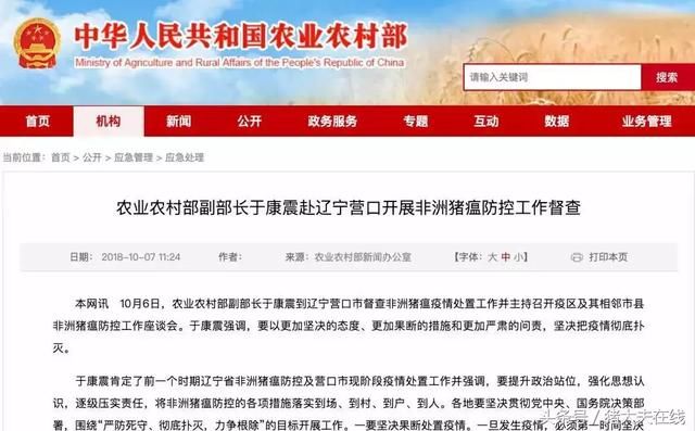 10月6日,农业农村部副部长于康震到辽宁营口市督查非洲猪瘟疫情处置工作并主持召开疫区及其相邻市县非洲猪瘟防控工作座谈会。
