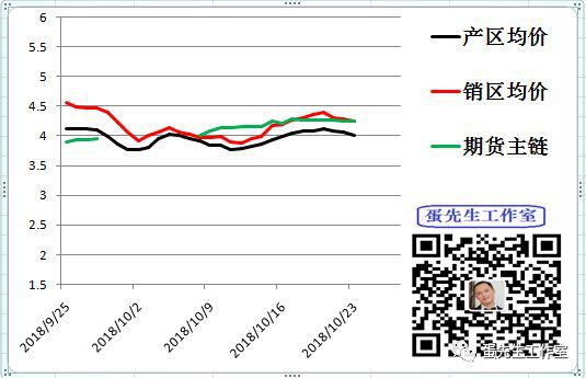 如下图所示:国庆之后,蛋价最高点出现在上周六10月20日,随后开始缓慢走弱,截止到今天10月23日,产区均价4元/斤,比上周六跌0.12元/斤,4元大关岌岌可危;销区均价4.24元/斤,比上周六跌0.16元/斤;同期鸡蛋期货主力1901也陷入了高位震荡,冲高受阻。