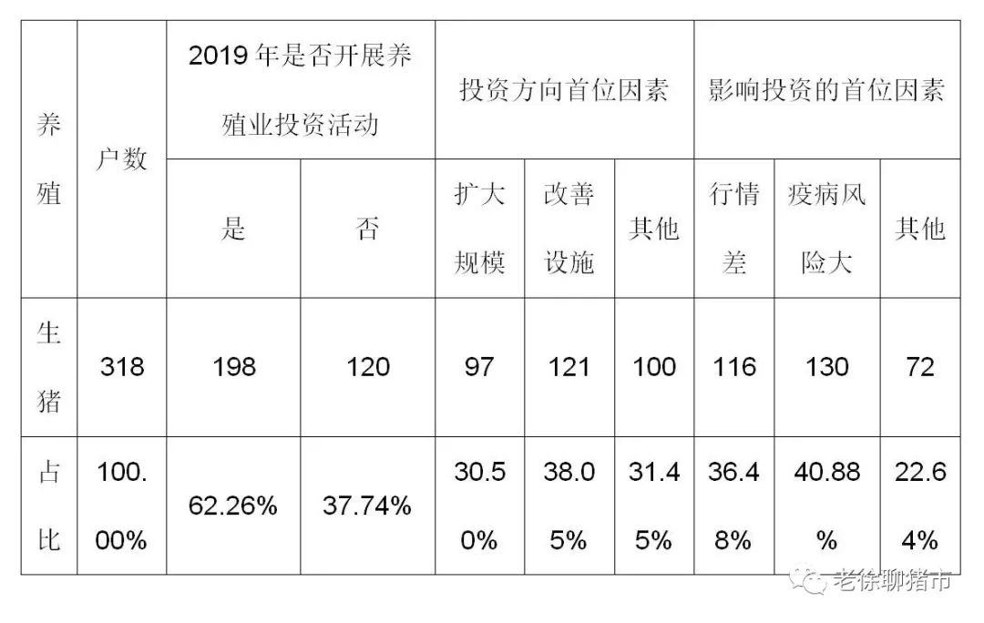 2019年,只有六成养殖户又投资计划;其中,决定养殖户投资生产的第一要素是改善生产设施,建设疫病防疫体系,保障生猪出栏安全;其次考虑的才是扩大规模。而在影响投资生产活动的因素中,疫病风险是4成养殖户考虑的首要因素,行情差紧追其后。受疫情影响,在疫苗未成功研制前,很多散户选择彻底退市。