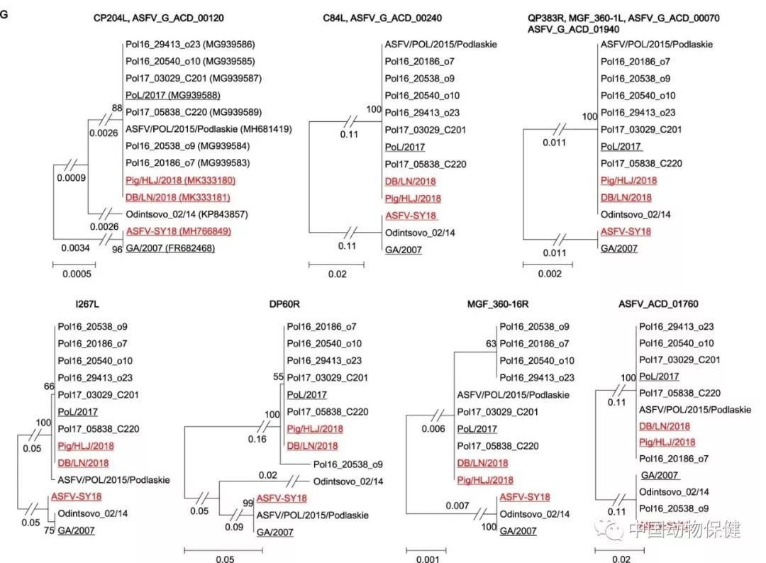 为研究样品病毒来源,本研究对以上ASFV序列进行了详细比较分析,发现Pig/HLJ/2018和DB/LN/2018的全基因组序列与波兰分离的ASFV的序列高度相似。