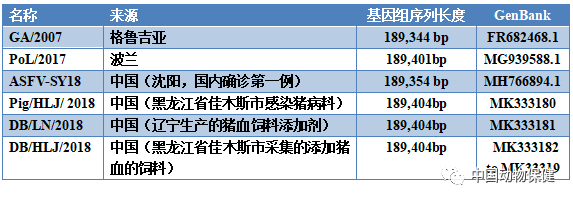 本研究从中国猪病料和干猪血饲料样品分离鉴定出两株病毒并进行了基因组分析。部分序列分析表明从黑龙江省佳木斯市采集的含猪血的饲料添加剂被类似的ASFV毒株污染。本研究从猪病料里分离到了一株活毒,并证明在猪群里具有高致死性和传染性(文中未展出数据)。