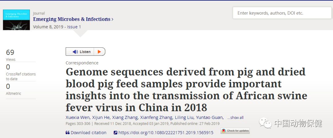 2019年2月27日,沈阳农业大学畜牧兽医学院张莹教授课题组在Emerging Microbes & Infections上发表题为Genome sequences derived from pig and dried blood pig feed samples provide important insights into the transmission of African swine fever virus in China in 2018的研究。