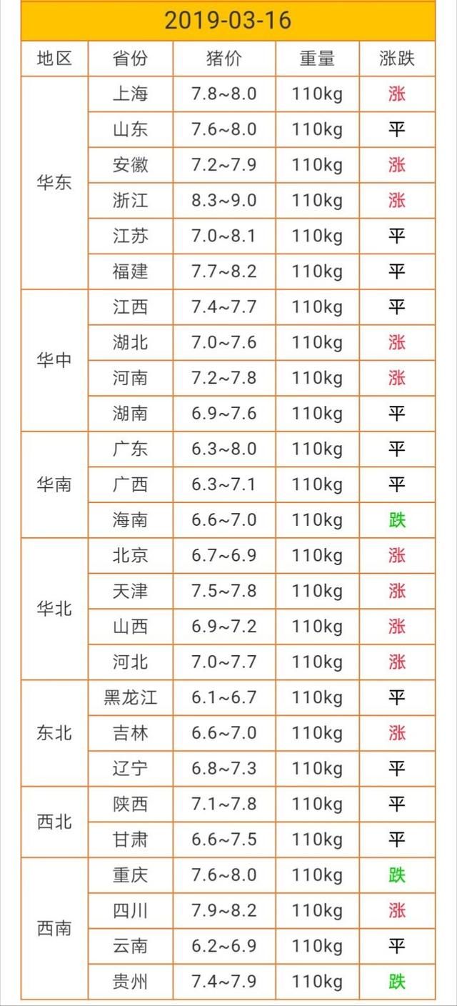 西北地区相对稳定,离破8的日子也是不远了。而华南和西南地区稳中伴跌,主要是前期受非洲猪瘟的影响较小,各地都有一定的生猪产能,况且,四川省邻水县在3月12日发生1起外地调入生猪发生非洲猪瘟疫情的事件,也对猪价的上涨之路造成一定影响。