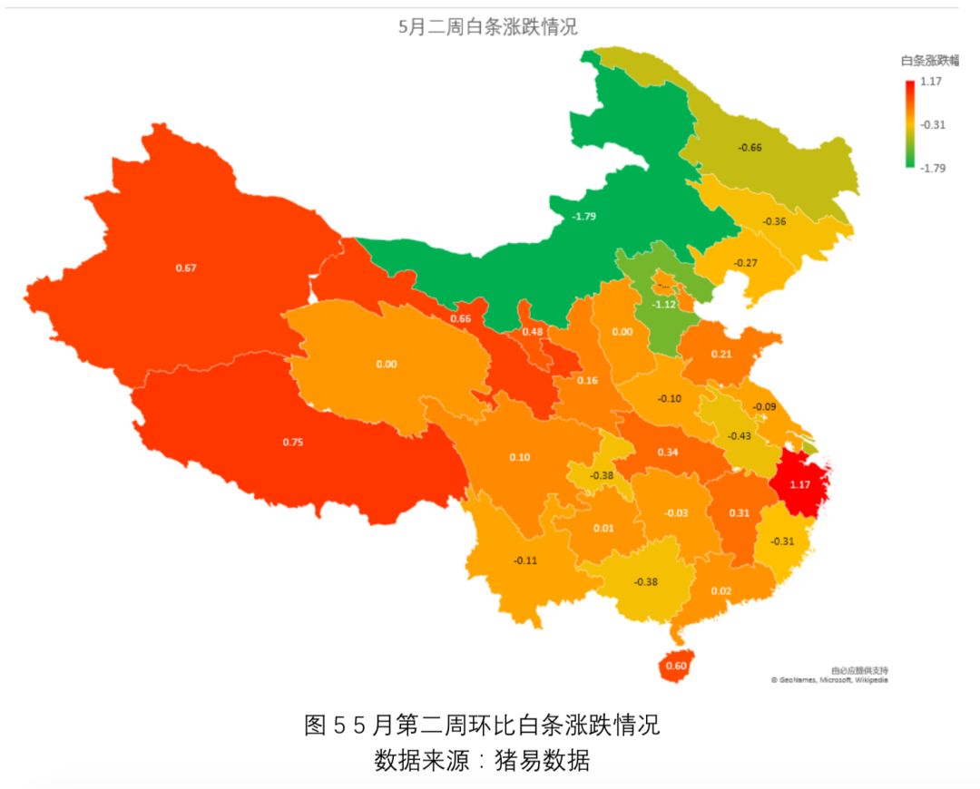 就 5 月份来说分别在五一假期期间、节后第二周初期白条价格出现上调,但在本周后期价格 开始回落,相对而言,本周猪价在五一节后上调,动作较慢,且在白条价格下调后回调的力 度和时间节点也较慢。