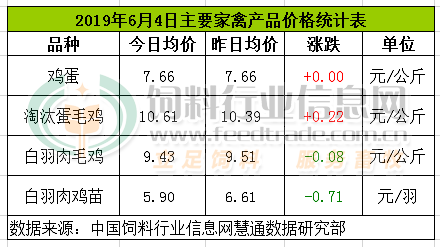 据饲料行业信息网慧通数据研究部数据统计,2019年6月4日中国主要家禽产品价格相对持稳部分产品涨跌互现。其中,鸡蛋价格持稳,淘汰蛋毛鸡价格反弹偏强调整,白羽肉毛鸡价格继续偏弱调整,肉鸡苗价格继续下调整理。