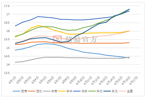 据猪易数据显示,本周(6月10—16日)全国外三元生猪均价为15.75元/公斤,与上周(6月3—9日)的15.6元/公斤上涨0.15元/公斤,涨幅0.96%。北方上涨势头非常猛,但是西南价格连续弱势运行,整体全国猪价小幅上扬。