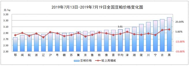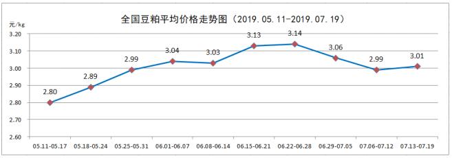 7月第3周,全国豆粕平均价格3.01元/kg,较上周(2.99元/kg)上涨0.67%。