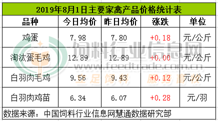 据饲料行业信息网慧通数据研究部数据统计,2019年8月1日中国主要家禽产品价格相对持稳部分产品涨跌互现。其中,鸡蛋价格继续偏强,淘汰蛋毛鸡价格持稳,白羽肉毛鸡价格继续偏强,肉鸡苗价格持续偏强。