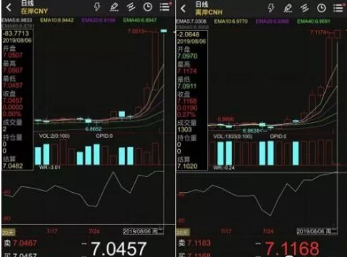 8月5日早间,人民币兑美元离岸汇率急速下跌,上午9点16分左右,离岸人民币兑美元汇率跌破7关口,随后再度下跌至破7.1,最低报7.1068,下跌幅度近1000点。在岸市场开盘后,在岸市场人民币兑美元汇率也随着下跌,到了9点32分左右,在岸人民币兑美元汇率也跌破7关口,最低报7.0349。同时,8月5日人民币兑美元中间价跌破6.9关口,为2018年12月以来首次。