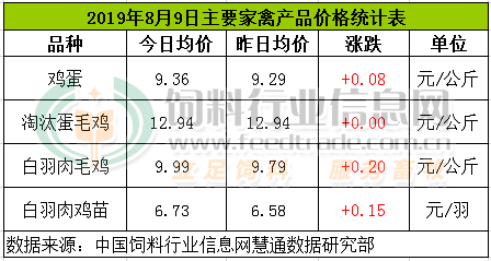 据饲料行业信息网慧通数据研究部数据统计,2019年8月9日中国主要家禽产品价格相对持稳部分产品涨跌互现。其中,鸡蛋价格持续偏强,淘汰蛋毛鸡价格继续持稳,白羽肉毛鸡价格再度偏强,肉鸡苗价格持续偏强。