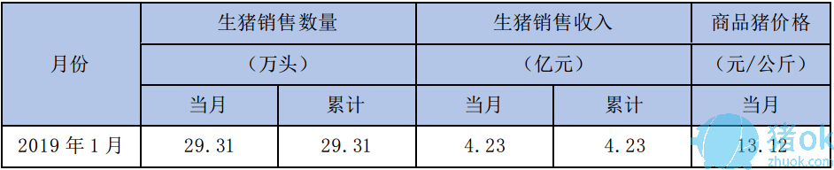 2019年1-7月,公司累计销售生猪110.38万头,同比增长 27.89%;累计销售收入15.47亿元,同比增长55.17%。