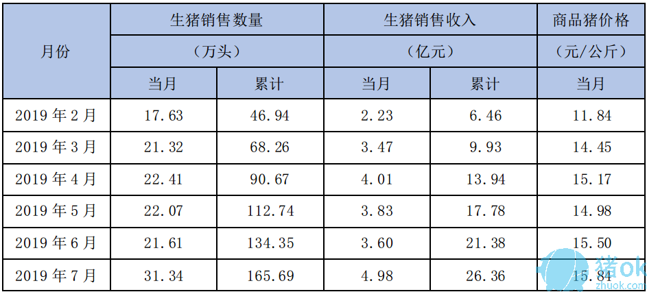 2019年7月,生猪销量及销售收入环比及同比增长较快,主要是由于公司生猪养殖业务产量进一步释放。