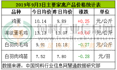 据饲料行业信息网慧通数据研究部数据统计,2019年9月3日中国主要家禽产品价格相对持稳部分产品涨跌互现。其中,鸡蛋价格震荡偏强,淘汰蛋毛鸡价格稳中偏强,白羽肉毛鸡价格再次继续回调,肉鸡苗价格继续回调。