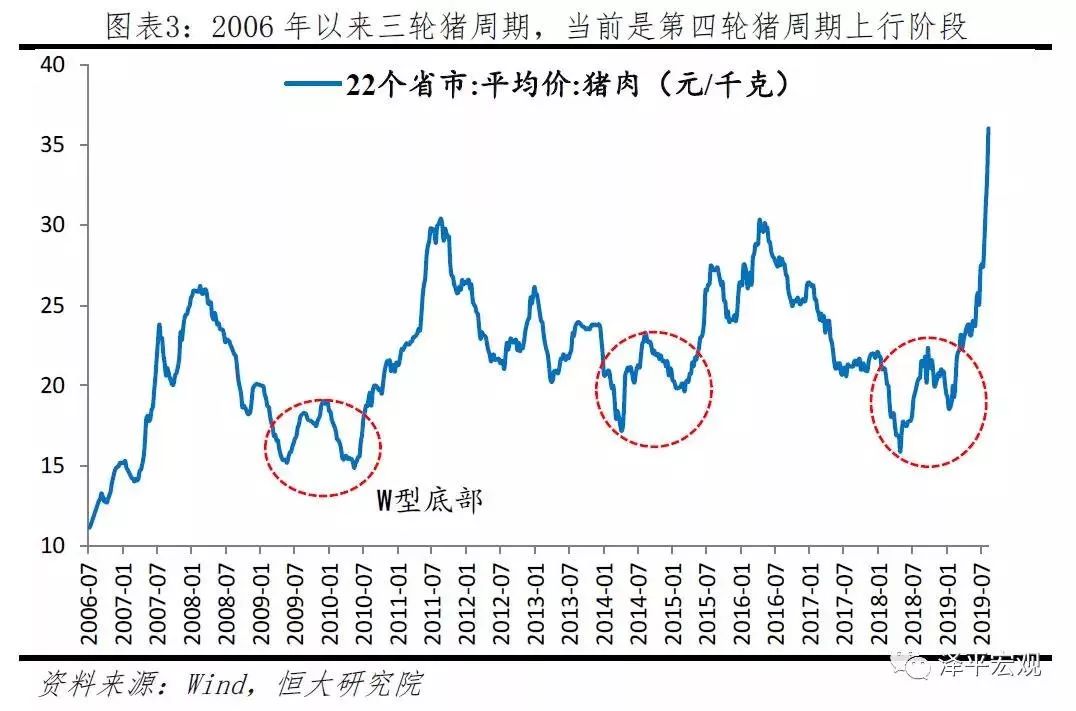 2006年以来,我国大致经历了四轮“猪周期”,主要有以下特点:一是每轮猪周期基本上在3-4年,下行时间略长于上行时间,主要是因为在下行阶段,利润下行但只要未亏损,养殖户退出的意愿不强;二是每轮猪周期均伴随疫病助推,但最近的猪周期相较过去明显存在非市场化的政策因素如环保干预;三是规模化和技术进步导致需要的能繁母猪和生猪存栏量下降,因此新一轮猪周期产能恢复后对应的存栏量将低于前期;四是不同于历次猪周期,本轮猪周期仅影响CPI,并未传导至PPI,核心CPI和非食品CPI下行、PPI连续为负,宏观环境是总需求不足。前三轮猪周期分别均历时4年左右,上行周期分别为2年、15个月和2年,最高涨幅分别为132.6%、98%和76.6%。