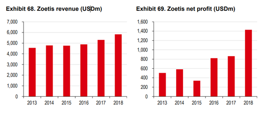 美国对动物保健的需求也大幅上升。硕腾是一家领先企业,凭借其强大的研发能力实现了增长。2011年,Zoetis的总收入为4.23亿美元,来自其牲畜业务的2.78亿美元,来自其伴侣动物医疗保健业务的1.46亿美元。硕腾于2012年独立上市。到2018年,收入和市场估值分别上升到58.3亿美元和600亿美元。