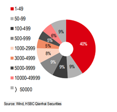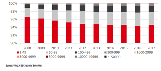 “支离破碎”这个词被广泛用于描述中国的许多行业,尤其是那些可能在未来几年整合的行业。养猪业相当引人注目,2017年中国3700万养猪场中,有3500户人每年生产不到50头猪。只有4500户出栏10 000多头猪,出栏50 000头以上仅400家集团。毫不奇怪,十大上市猪业公司的市场份额仅为7.38%。