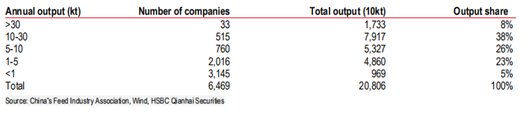 目前仍有5000家饲料公司,占所有饲料公司的80%,年产量不到5万吨。