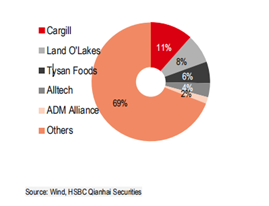 上游饲料和动物保健行业也比中国同行更加集中。前五名动物保健公司的市场份额为55%,领先五位。饲料公司前五名的市场份额超过了30%。