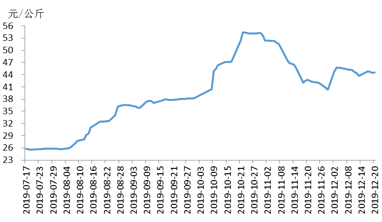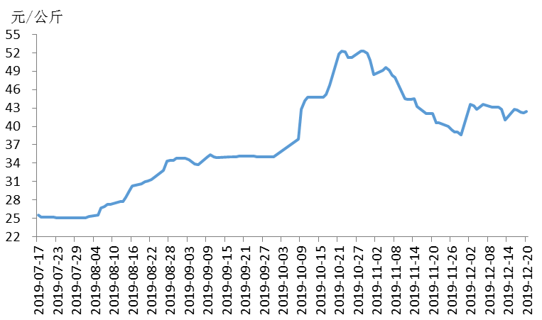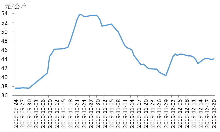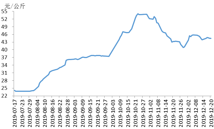 据农业农村部信息中心和山东卓创资讯股份有限公司联合监测,2019年第51周(即12月16日-12月20日,以下简称本周),16省(直辖市)瘦肉型白条猪肉出厂价格总指数的周平均值为每公斤44.06元,环比微跌0.2%,同比涨145.9%。