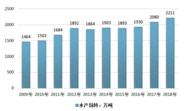 2017年我国水产饲料产量为2080万吨,2018年我国水产饲料产量增长至2211万吨,近年来我国水产饲料占商品饲料产量比重维持在10%左右。