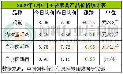 据饲料行业信息网慧通数据研究部数据统计,2019年1月6日中国主要家禽产品价格相对下跌部分产品涨跌互现。其中,鸡蛋价格蛋价持续偏强,淘汰蛋毛鸡价格再次偏弱,白羽肉毛鸡价格持续偏弱,肉鸡苗价格再次偏弱。